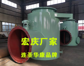 4、分匯器是一個三通閥,通過導(dǎo)向板的切換可使膠球進(jìn)入需要清洗的一側(cè)凝汽器中工作。一般一臺機(jī)組需兩臺分匯器,其進(jìn)口通徑為DN100,分配口為DN89,膠球投用時可通過窺視窗觀察運行情況。FH型分匯器(清潔海綿膠球切換三通管閥)